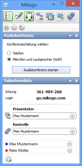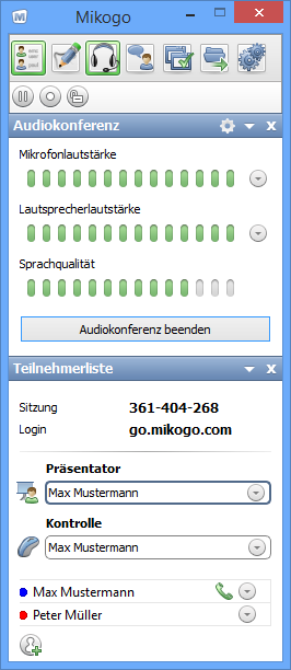 Nachdem sie „Teilnehmen“ angeklickt haben, werden Ihre Teilnehmer mit der VoIP-Konferenz verbunden und Sie können mit ihnen über die Mikogo-Software sprechen. Neben dem Namen des Organisators und der Teilnehmer wird ein grünes Telefon-Symbol angezeigt, das darauf hinweist, dass sie der VoIP-Konferenz beigetreten sind und sowohl mit den anderen Sitzungsteilnehmern sprechen als auch von ihnen gehört werden können.