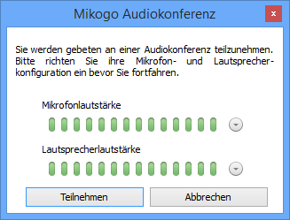 3. Sobald die Teilnehmer Ihrer Screen Sharing-Sitzung beigetreten sind, sehen sie das unten abgebildete Pop-up-Fenster. Mithilfe des Drop-Down-Menüs dieses Fensters können sie einstellen, welches Mikrofon und welche Lautsprecher für die Konferenz benutzt werden sollen, falls ihr Computer mehrere Audio-Anschlüsse hat.
